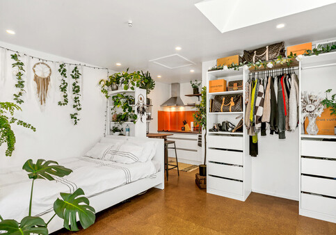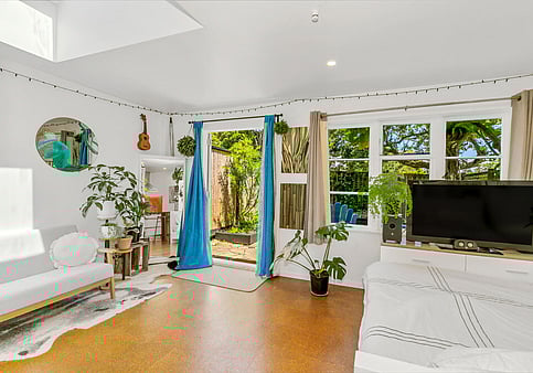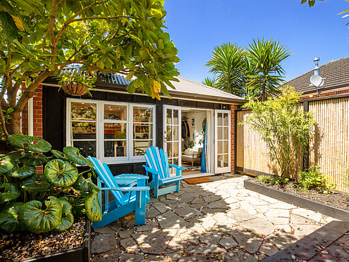 An existing 5m by 5m carport is transformed into a self-contained apartment or tiny home at the front of the main house for the newly independent teen. Complete with a kitchenette and ensuite, the space is compatible with the aesthetic of the existing home just behind the bamboo privacy screen.